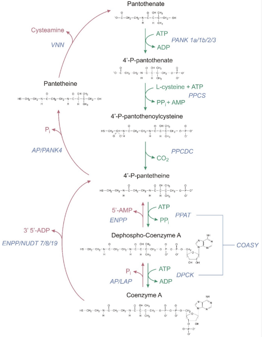 Daraus geht hervor, dass oral eingenommenes Pantethin keinen Vorteil gegenüber einfacher Pantothensäure darstellt, sondern nur einen Nachteil hinsichtlich der Erhöhung des CoA-Spiegels, d mit anderen Worten des Vitamins B5. Es gab jedoch klinische Studien am Menschen, in denen hohe orale Dosen von Pantethin getestet wurden, um festzustellen, ob es bei Kindern mit so genannten PANK-Mutationen den CoA-Spiegel erhöhen kann. [2] Dabei handelt es sich um ein genetisches Problem, bei dem Pantothensäure von den Zellen nicht in aktives CoA umgewandelt werden kann; unter einer Million sind ein-zwei Menschen betroffen, und die Mutation verursacht eine neurologische Erkrankung namens PKAN. Eine Behandlung mit Pantethin bei Fruchtfliegen, die eine PANK-Mutation aufwiesen, überbrückte dieses Umwandlungsproblem, weshalb es auch beim Menschen ausprobiert wurde. [2] Ich nehme an, dass es einfacher war, es oral statt intravenös zu verabreichen, obwohl mich das überrascht, denn bereits frühere Studien haben gezeigt, dass die orale Verabreichung keinen Vorteil gegenüber einfachem Ca-Pantothenat hat. Und so war es dann auch: